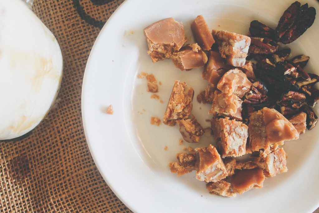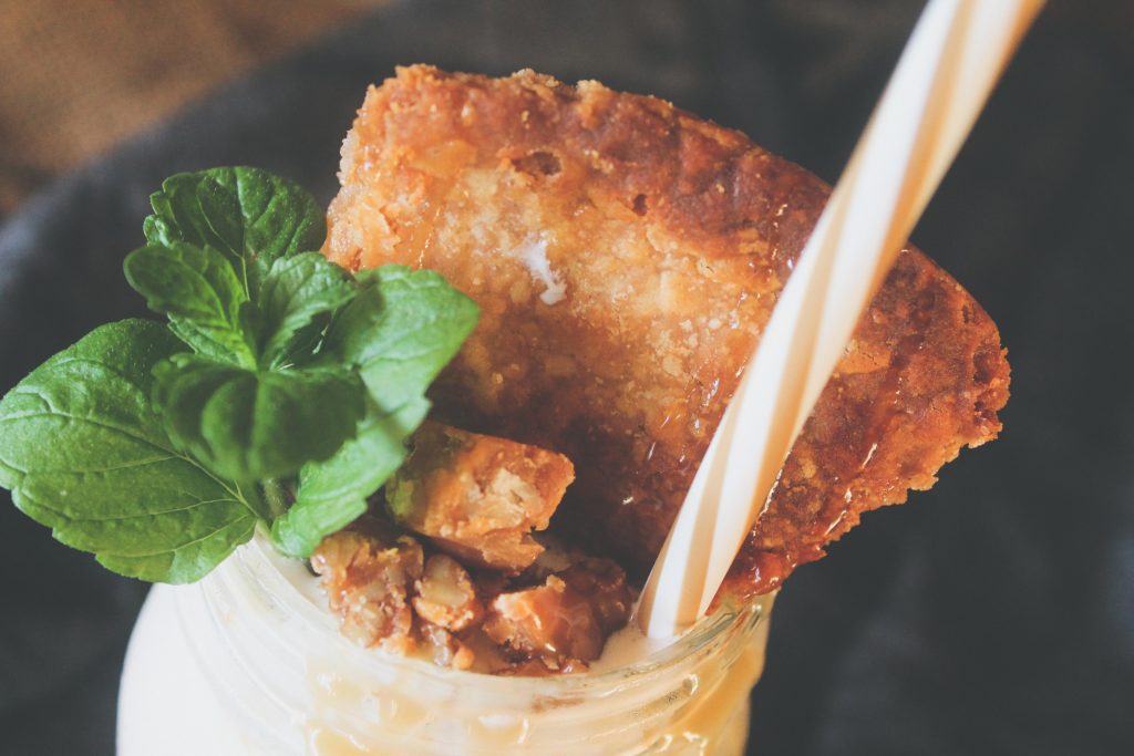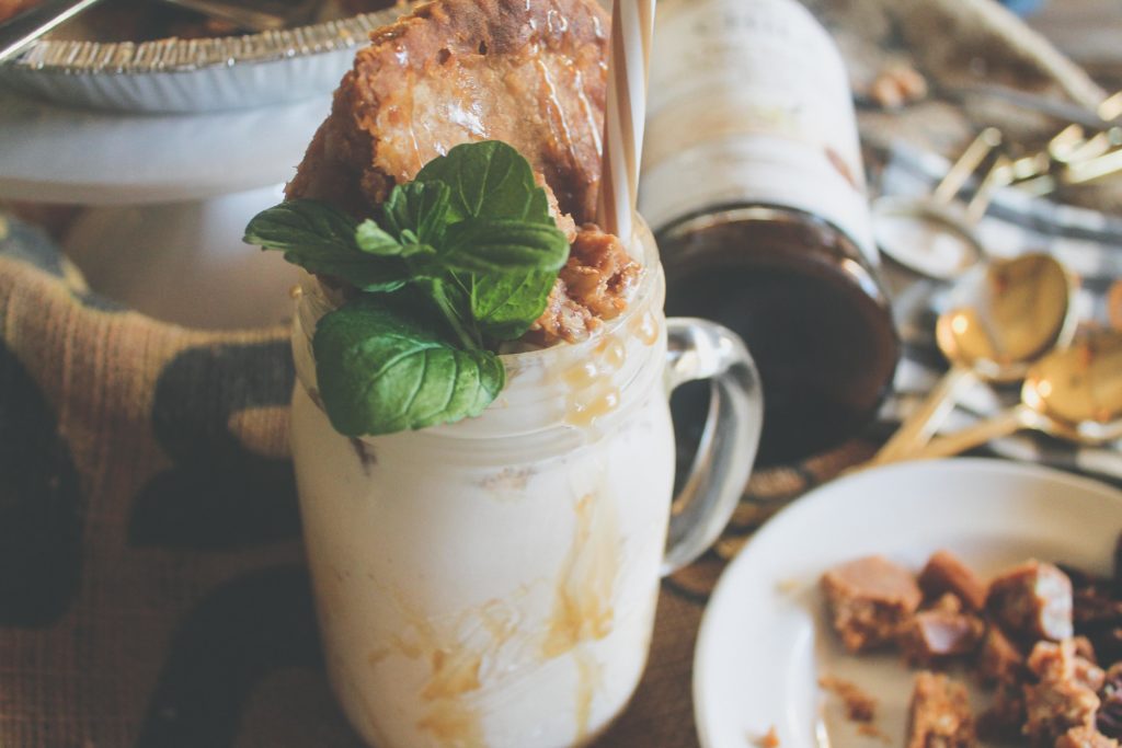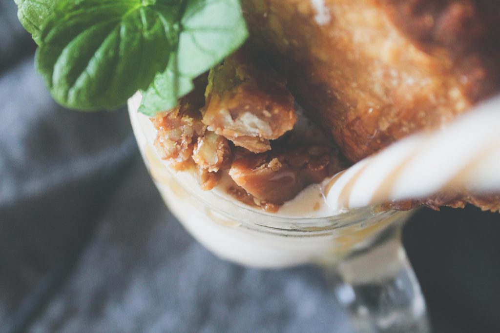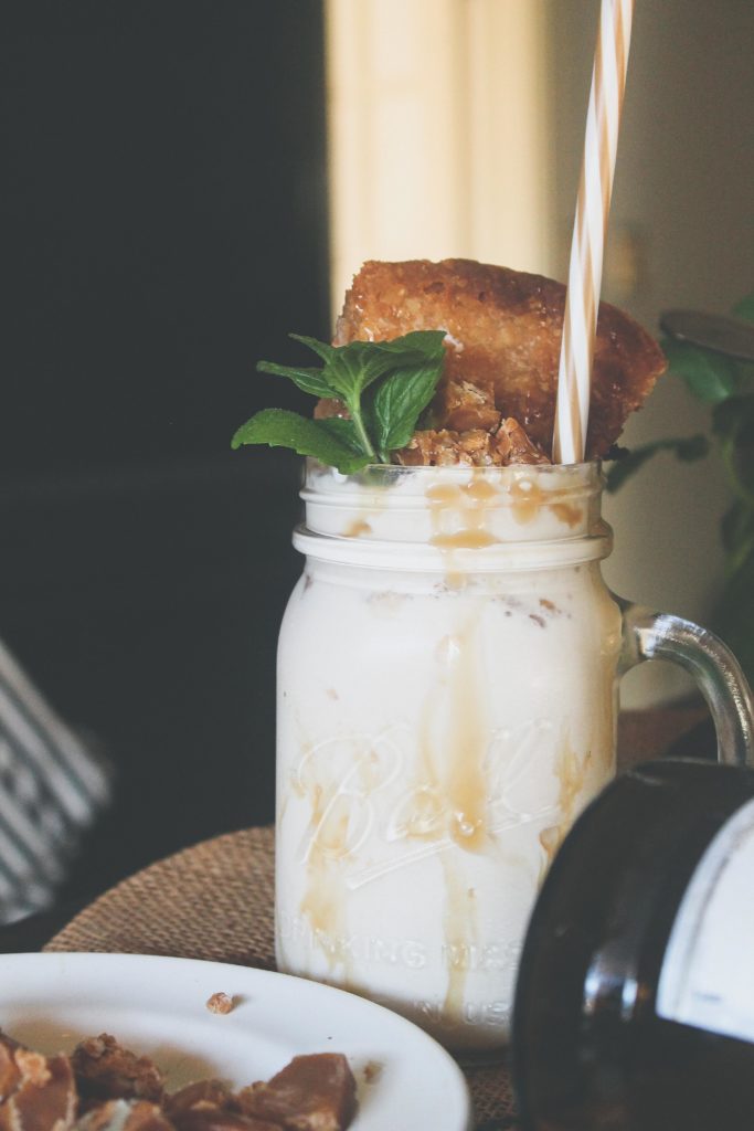 I got out some mason jar mugs and got to work. With vanilla ice cream as a base, I blended in a few ounces of ‘Orchata with ice, in my blender. It looked like a pinã colada at this point. Except this creamy base is laced with cinnamon. I taste-tested the frozen base and knew I was on the right track. Next, I lined the cups with caramel sauce, cut-up a pecan praline candy, and fresh mint for garnish.