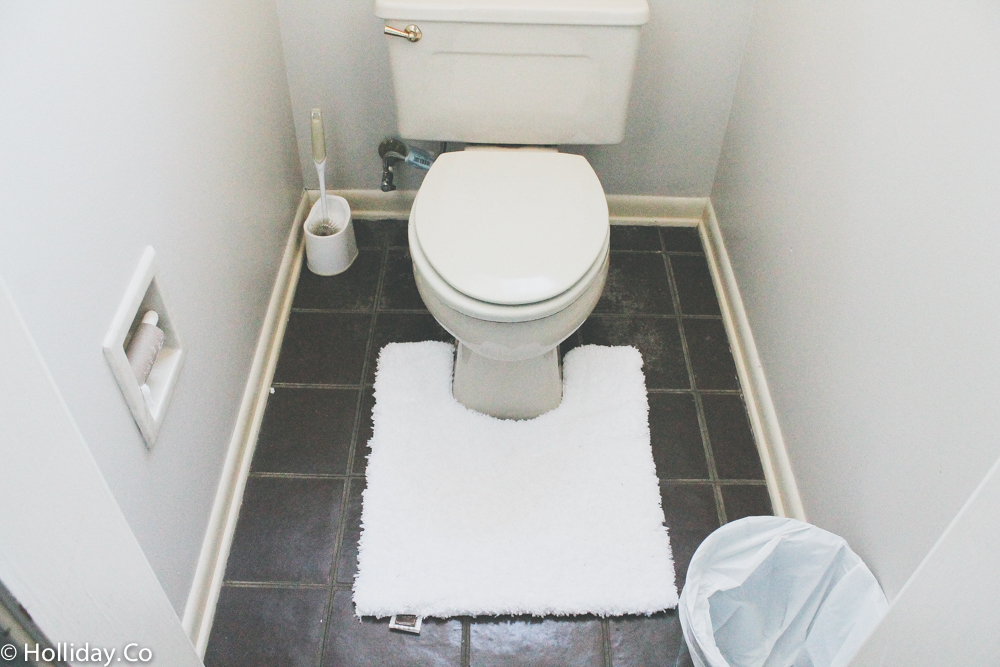 This project all started due to a leaking toilet. A couple of weeks back we noticed the toilet base was leaking – ONTO THE FLOOR. This was definitely an issue! How long had the toilet been leaking? Should we just replace it or address the floor too? Soon, changing the floor turned into demoing the entire bathroom. I could have painted the vanities, updated the light fixtures, and replaced the toilet. Refinishing the tub could also have been done. It would have looked, refreshed, but not updated. We couldn’t make peace with partial updates. In the long run, that just didn’t make sense. So we’ve officially embarked on a 2-3 week renovation. View the bathroom mood board here.