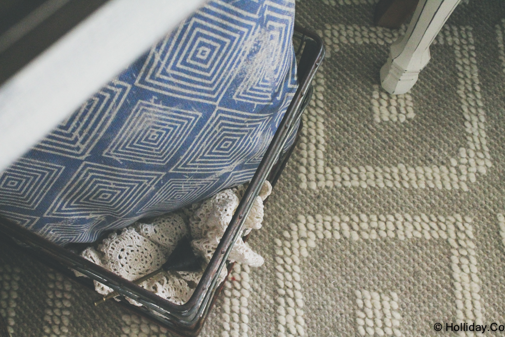 My grandmother’s vintage blanket in a Nate Berkus fringed basket that holds books.
