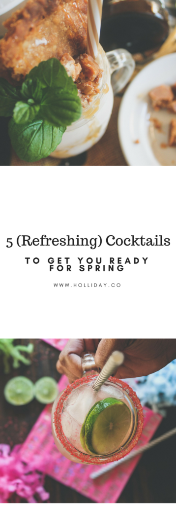 Guys? Guess what?! Spring will be here really, really soon and I cannot wait. This past winter was long and rough for a lot of reasons. Now that spring is blooming I’m excited for what’s ahead for my business and my life. Hopefully you’re feeling the same way. To get you ready, I’ve decided to share 5 refreshing cocktails to get you ready for spring. Brandon and I have had so much fun creating cocktails in the kitchen together. Brandon is really good at recipe development and I love styling the drinks. Here are a few of my favorites.