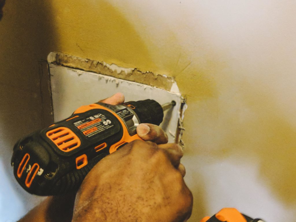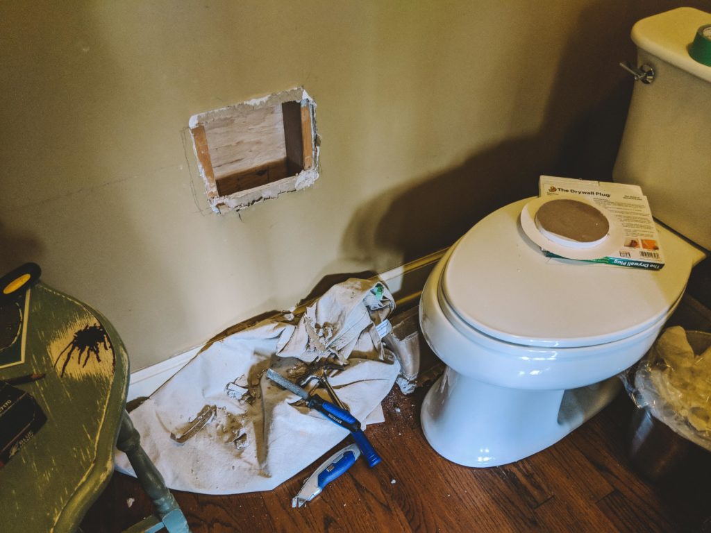 Next, I pulled, yanked, and removed the marble toilet paper tissue holder from the wall. We had a scrap piece of sheetrock that Brandon cut and installed to replace the hole. Then I patched it up with joint compound, sanded it, and then it was ready for painting. This mini project was very messy. Sheetrock work is messy, dusty, and I have no plans of doing it professionally. However, it was so gratifying to pull the last outdated toilet tissue holder out the wall. There are officially no more of these in our home!