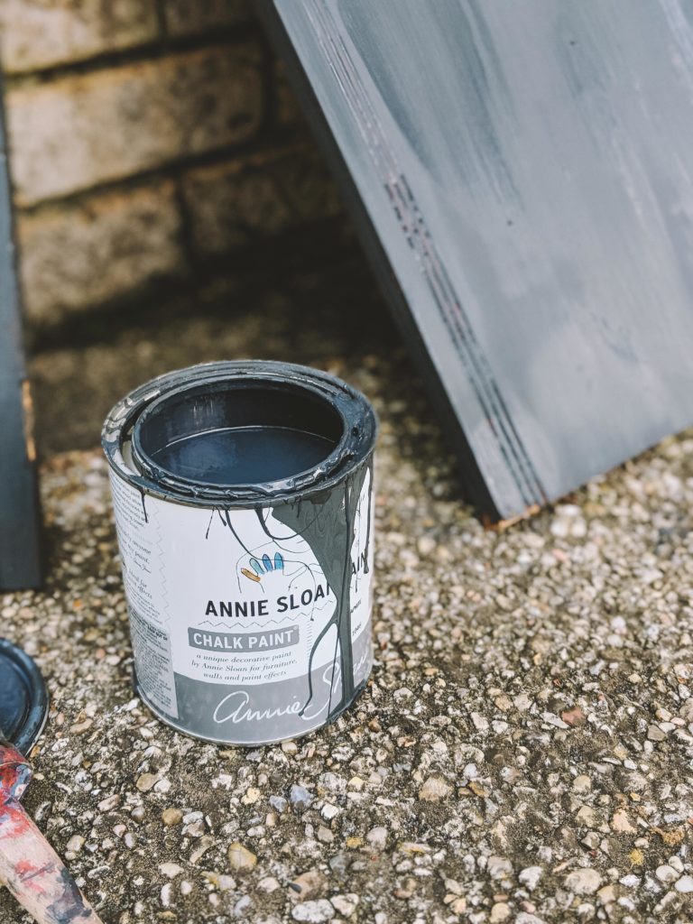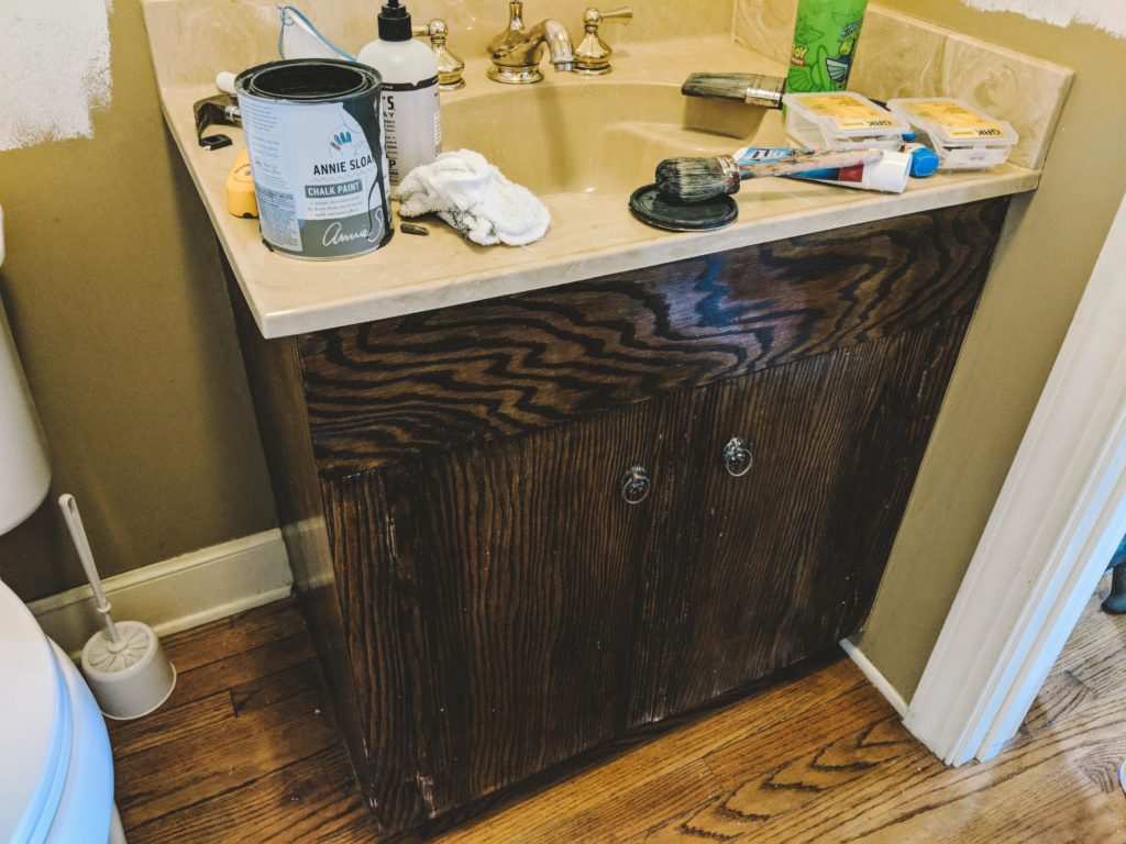There are parts of this space that I knew I could easily address like the vanity. Since we decided on a white for the walls, it was an easy decision to go with Annie Sloan Chalk Paint in Graphite. I previously used ASCP Graphite on my fireplace and it’s been one of my favorites ever since. Plus, I had the Annie Sloan Chalk Paint on hand so no money was spent on this portion of the makeover either. I also removed the hinges and knobs so I could spray paint them.