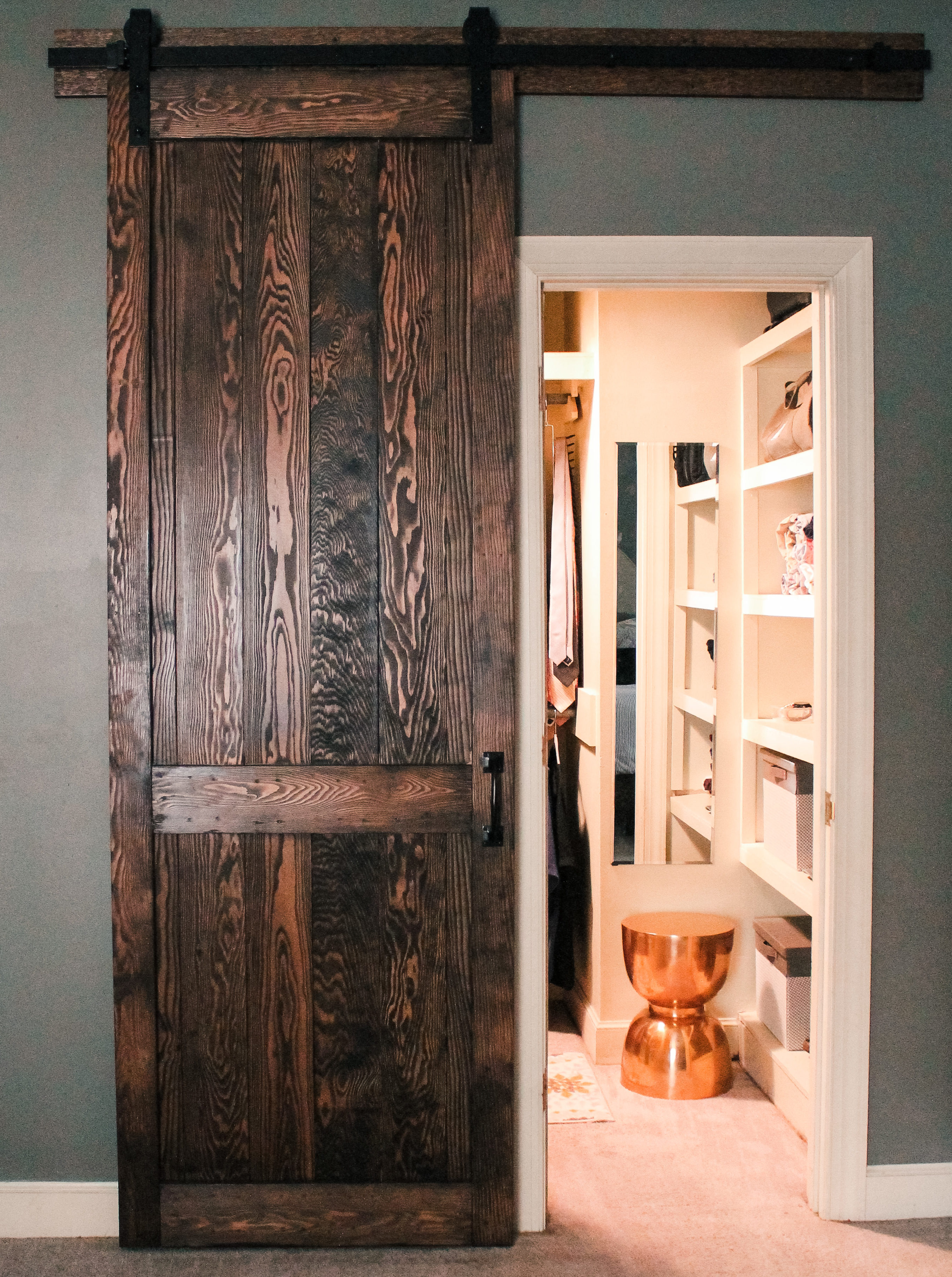 If you’ve been thinking about doing this DIY project of building a barn door, then don’t delay. It’s the perfect weekend project and is so worth it. We’ll be working on the tutorial to give you more details on how we constructed ours. I’ll also share important details like the kind of wood and stain we used, as well as the sliding door kit we purchased.