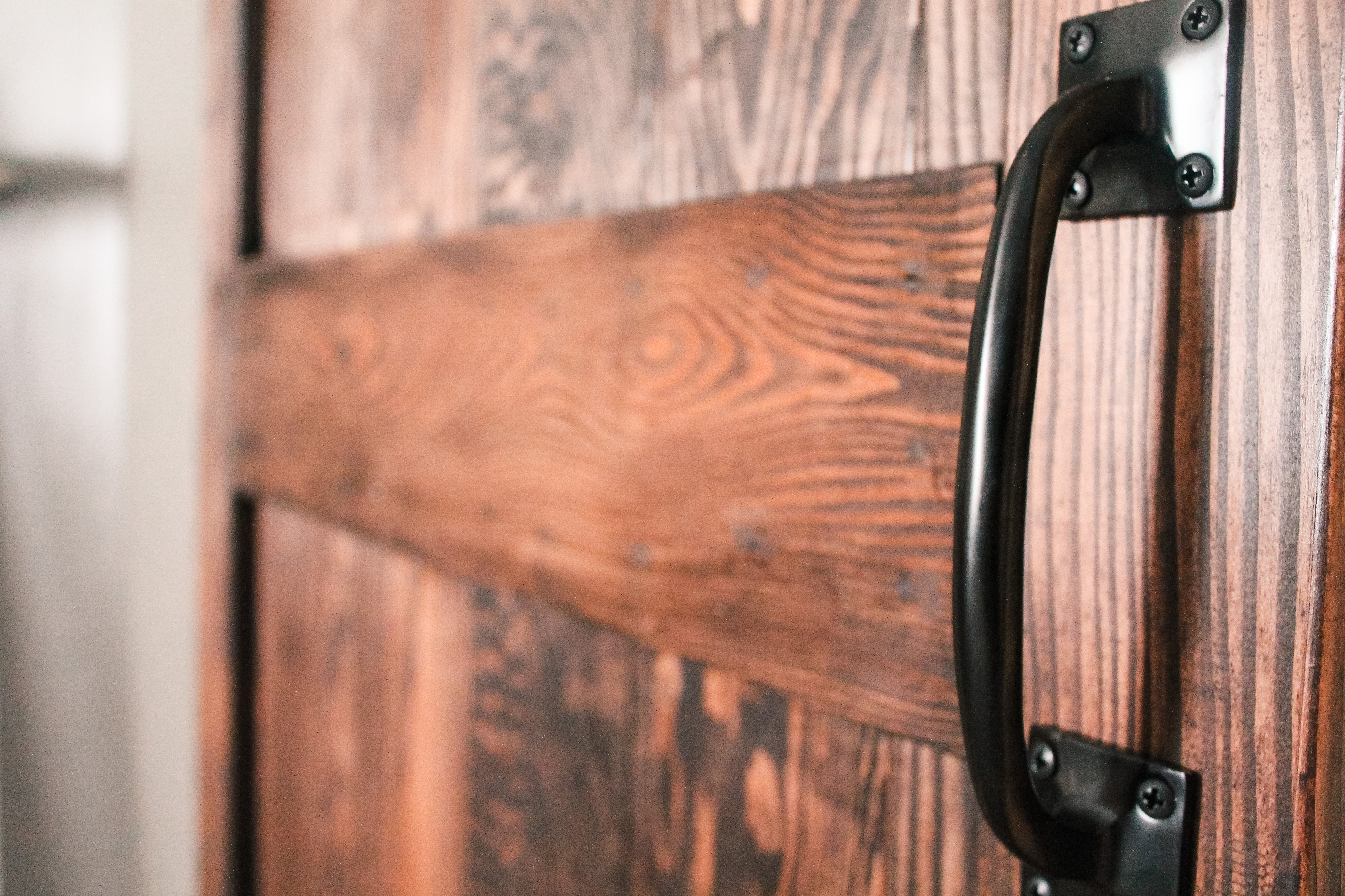 After construction, filling holes, sanding, staining, drying times, installing the sliding door hardware, and lots of patience we have a beautiful sliding barn door. Whew! We did this project over the course of a week but this could be done as a weekend project. We learned so much that will help us with other home projects. I really, really, love this door!