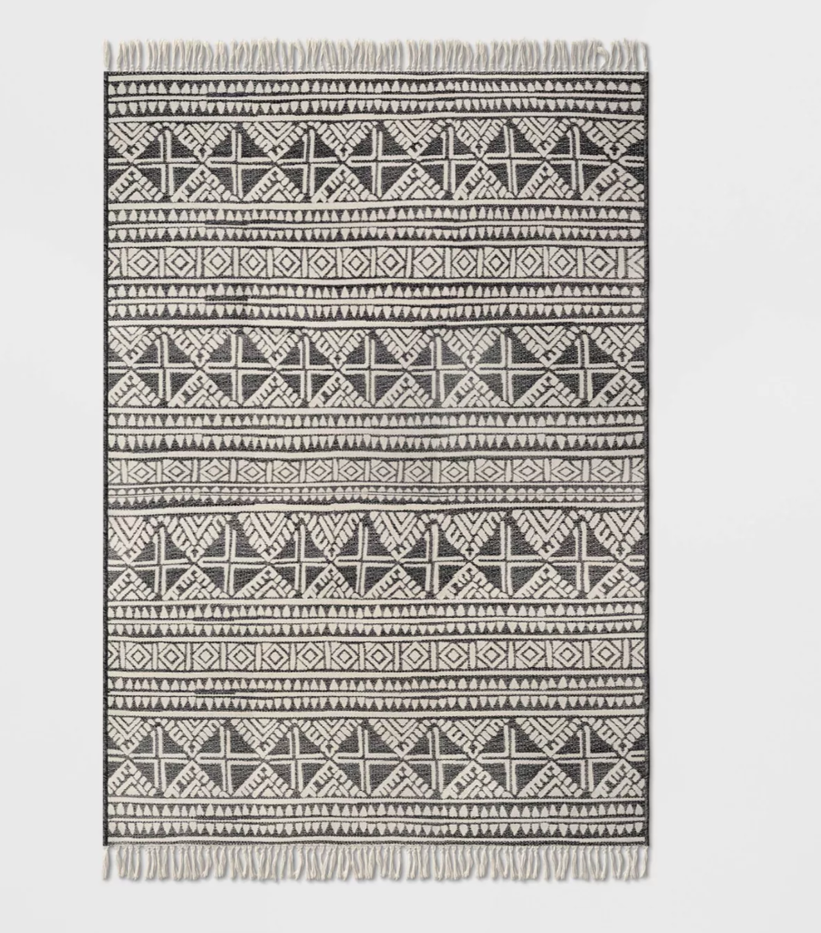 Here is the tasseled charcoal Opalhouse rug that I have plans to layer on top of the other rug. It’s got pattern, texture, and dimension. Do you see the tassels? Tassels on an outdoor space excite me! You may think it’s too dressy or rather too much, but I feel it adds in this unexpected touch. I’ve been using it in the space and it’s holding up well for an outdoor rug. It also pulls in the the charcoal color that will be in the patio set. Here is the Diamond Pixel Project 62 rug on the front porch. I highly recommend it too!