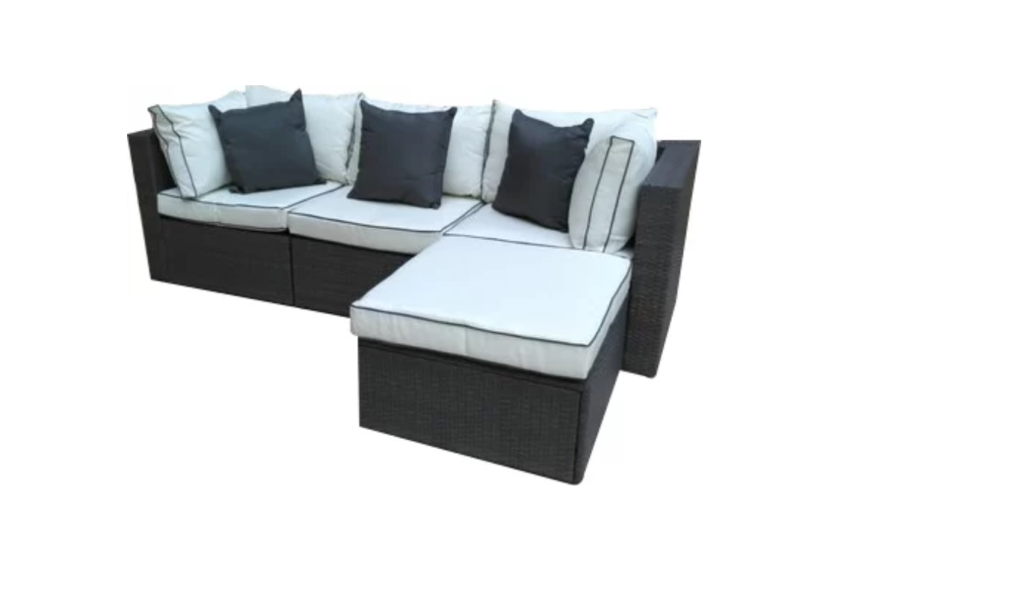 This would normally be an in-store purchase for me, but since I can’t do that well right now I turned to the internet. After a lot of searching (and getting advice from you guys), I found a patio sofa set that I’m hoping has been worth the wait, the Burruss Patio Sectional. I read all the reviews and looked at all the user pictures before I made my decision. Also, the space constraints were an issue. My back porch isn’t huge by any means. So, I knew a 4-5 piece patio set would be sufficient.