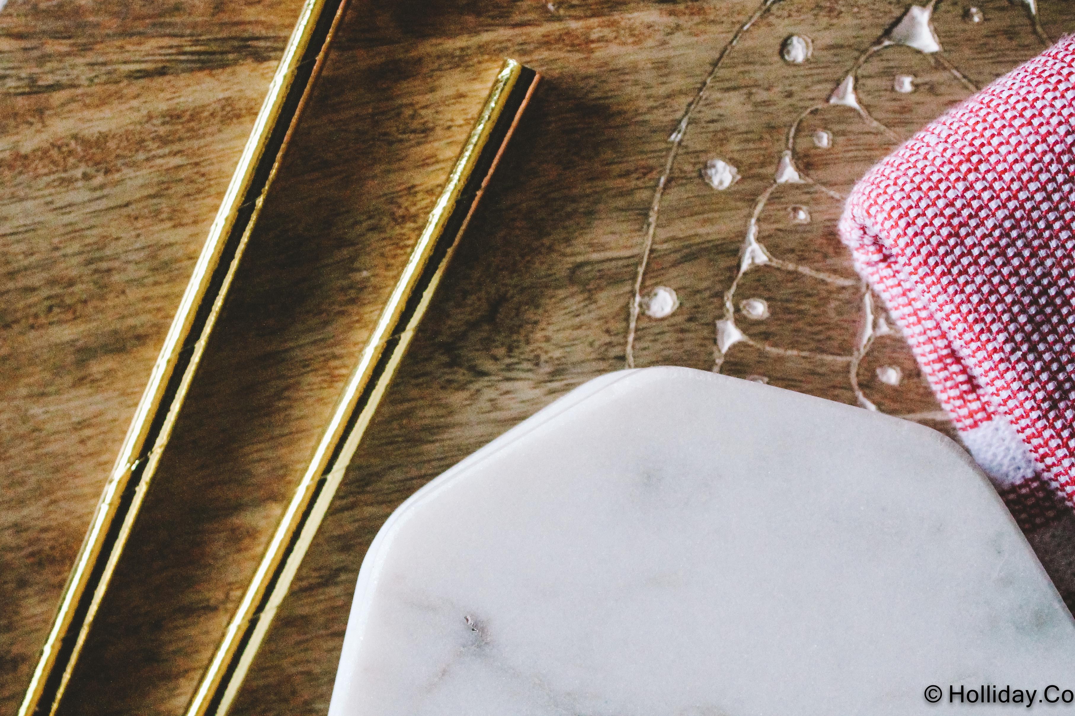 Flowers (fresh or faux), herbs like rosemary and thyme, and sliced fruit are simple touches that convey the love you put into entertaining. Decorative party-ware is another simple way to beautify the tray. Metallic straws and napkins give a “WOW” factor without much effort. Marble coasters protect the tray from water damage and also is one more detail that pulls the entire look together.
