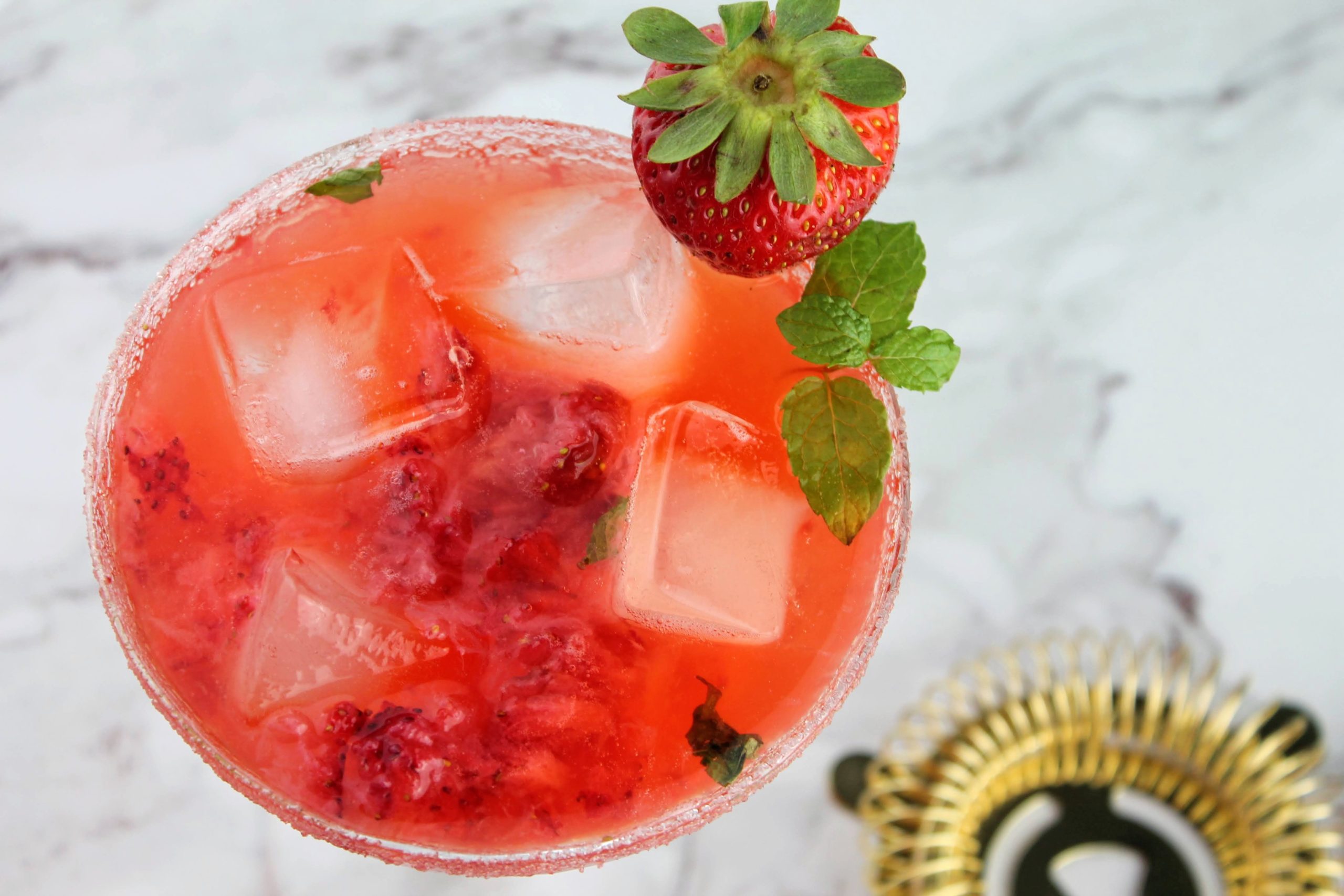 I like to keep the strawberries in the glass and enjoy those as I go. You could extract them with a strainer if you’d like too though. Always garnish with fresh fruit or herbs to beautify your drinks. I used fresh strawberries, mint, and a sugar-rimmed glass to beautiful this cocktail. You could also use lime slices as well.