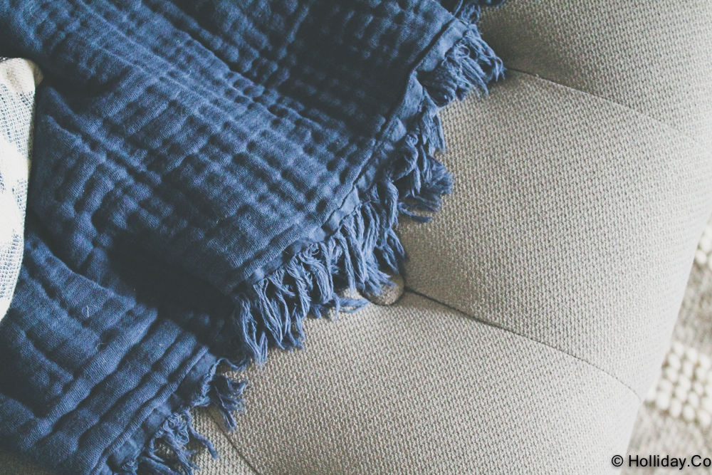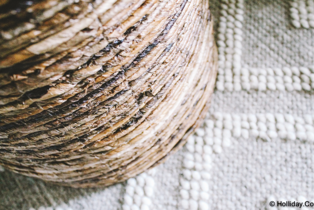 My grandmother’s vintage blanket in a Nate Berkus fringed basket that holds books.