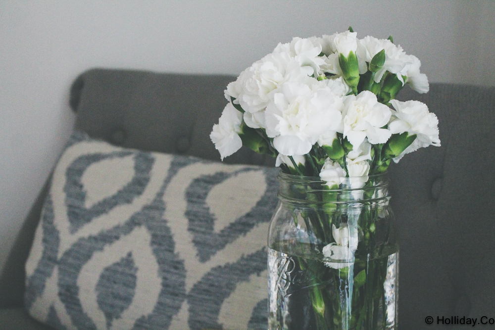The DIY Console Table styled with vintage books, white carnations, and Target Threshold lamps.